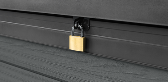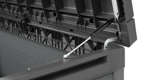 Regain a spacious and uncluttered outdoor space with the new Cortina storage Box, also known as Cortina 200. Double-walled EvotechTM panels give this outdoor storage box extra stability and sturdiness, making it perfect for family and utility use. Ultra-durable no-dent resin and UV coating make the Cortina all-weather resistant, ready to withstand years of rain and shine with zero maintenance. With a beautiful wood-like texture and dual-tone design, the Cortina blends into any outdoor setting. An overhanging top lid and smooth double piston system keep water out and fingers safe, while providing easy top access to 200 Gal/ 757 L of space. Ideal for storing garden cushions and sports gear, as well as large tools which can be safely locked away.