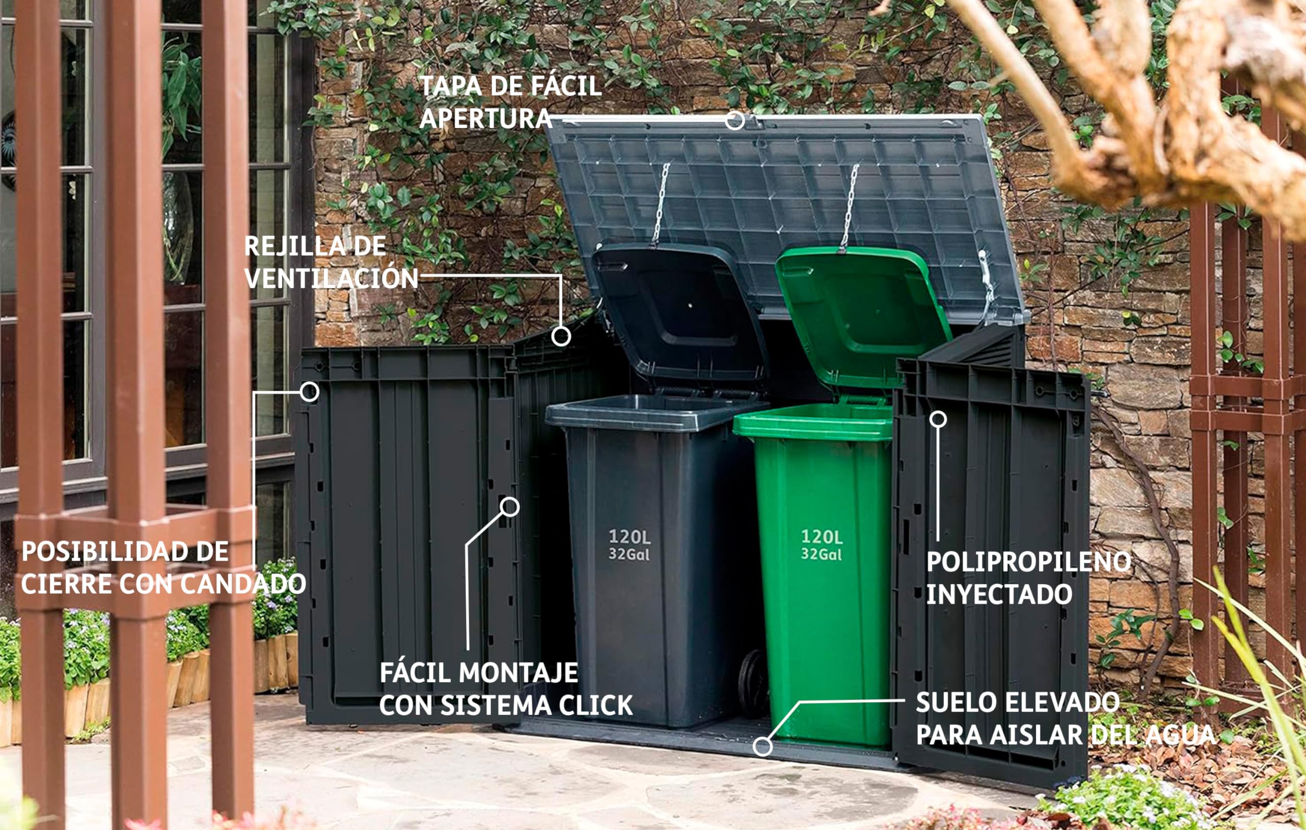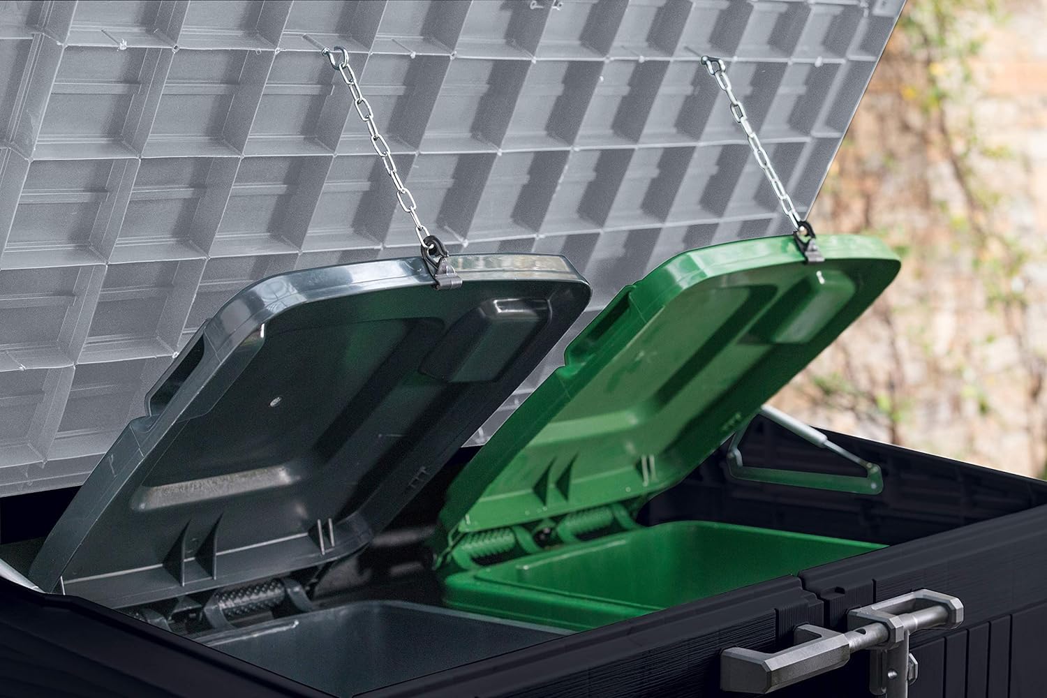 • Ideal outdoor storage solution for garden tools and equipment, BBQ and accessories and x2 120L wheelie bins