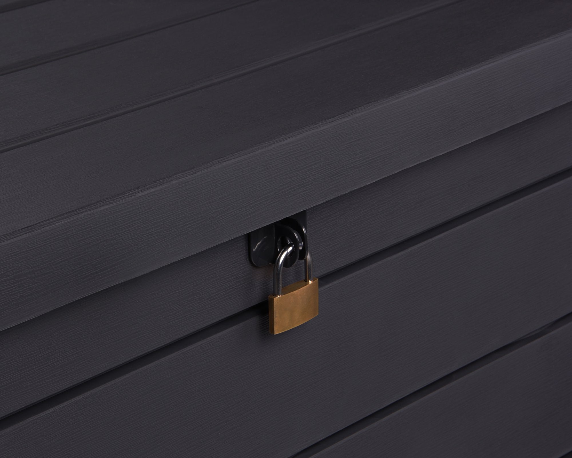 - It protects your lounge cushions or other garden utensils. The universal storage box is lockable with padlock (not included) and has a deceptively real wood look, which makes the chest a real eye-catcher.