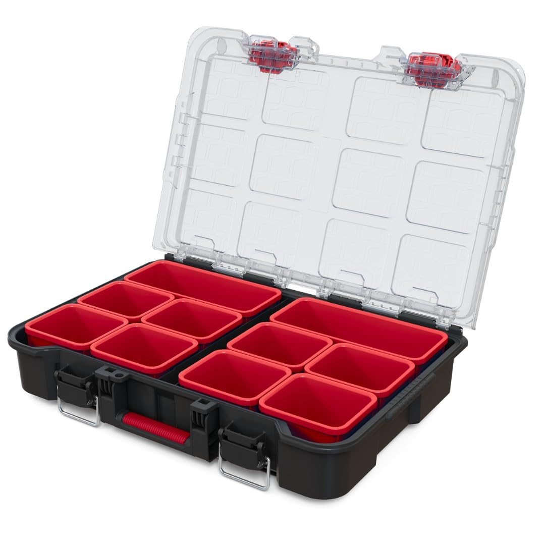 - Multiple sized removable bins for custom configuration & Transparent, polycarbonate lid to offer easy visibility