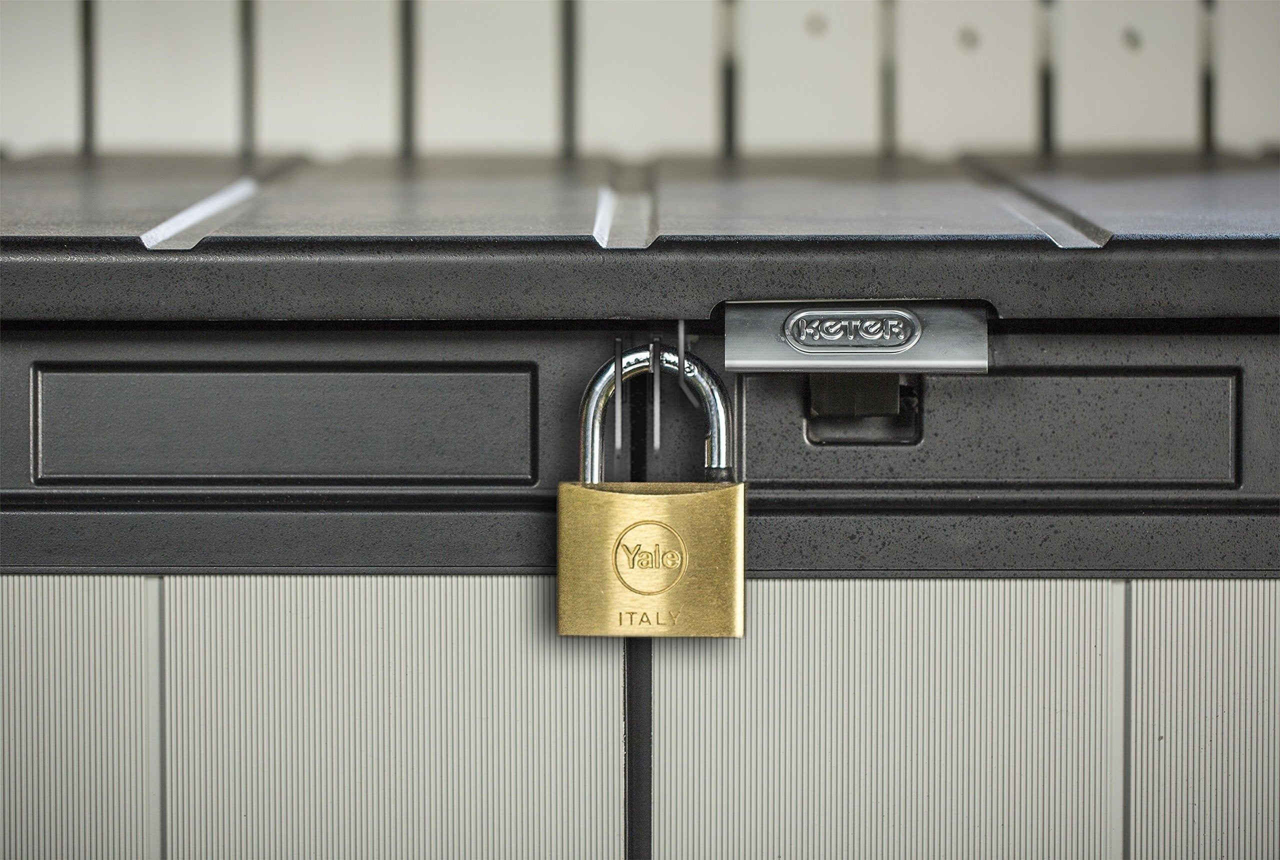 - Ideal outdoor storage solution for garden tools, equipment and X2 240 L wheelie bins