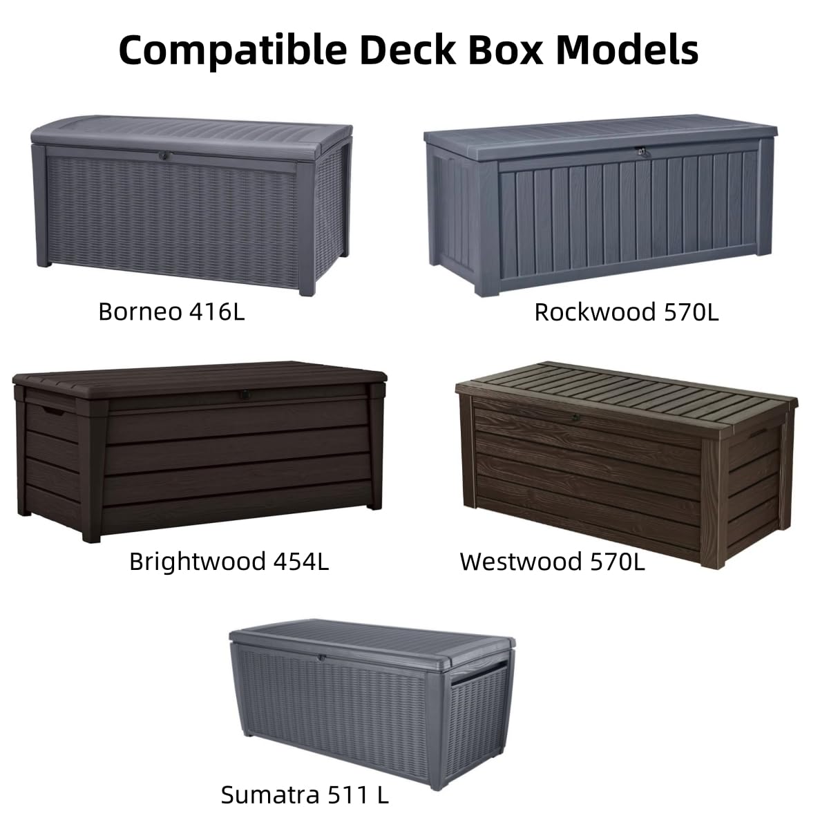 • Wide Application – The replacement works the same as Keter hinge part number SOP. It fits the following Keter Deck Storage box Units – Rockwood 570L / Westwood 570L / Sumatra 511L/ Brightwood 454L / Borneo 416L.